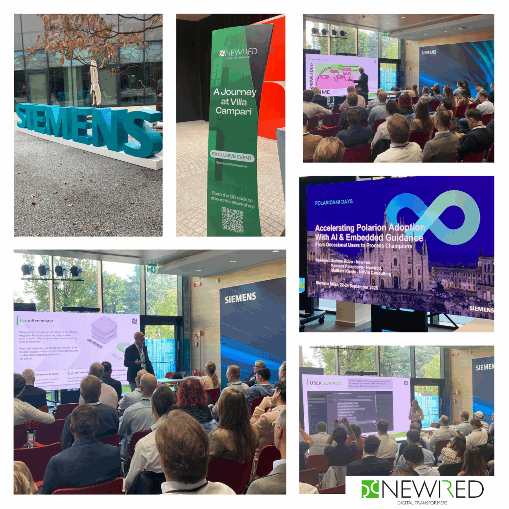 This past month, Newired had the privilege of taking the stage at Polarion4U Days 2025 in Milan — and what a performance it was! From leading workshops on AI-powered embedded guidance to connecting with so many of you at our exclusive Villa Campari networking evening, we were inspired by the passion and commitment of the Polarion community.
